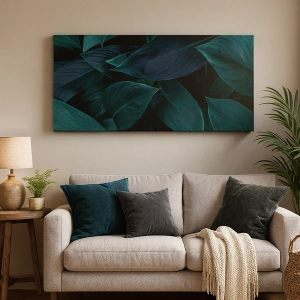 L'impression sur toile « Vert en soi » est une décoration unique qui allie la subtilité de la nature à l'élégance d'un design moderne. Les feuilles vertes présentées sur un fond sombre et profond créent un contraste saisissant, mettant en valeur les détails et harmonisant l'intérieur.