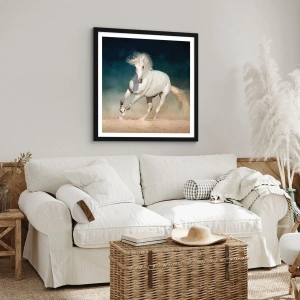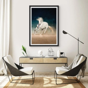 Affiche dans un cadre noir - Poster - Un cheval blanc galopant sur le sol sablonneux - 50x70cm - La liberté à l'état pur - Décoration murale moderne pour le salon et la chambre ARTTOR