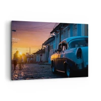 Impression sur toile - Image sur toile - Voiture et vélo rétro dans la rue à la lumière du soleil couchant - 100x70cm - Ici, le temps ralentit - Décoration murale moderne pour le salon et la chambre ARTTOR