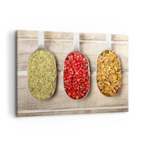Impression sur toile - Image sur toile - Trois cuillères en métal avec des épices sur un fond en bois - 100x70cm - Magie de la cuisine - Décoration murale moderne pour le salon et la chambre ARTTOR