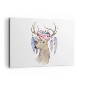 Impression sur toile - Image sur toile - Cerf romantique avec fleurs et plumes - 120x80cm - Guide de l'âme - doux, innocent - Décoration murale moderne pour le salon et la chambre ARTTOR