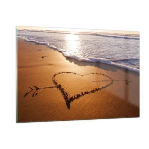 Impression sur verre - Image sur verre - Un cœur dessiné dans le sable illuminé par les rayons du soleil - 120x80cm - Confession de vacances - Décoration murale moderne pour le salon et la chambre ARTTOR