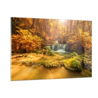 Impression sur verre - Image sur verre - Cascade forestière en or - 120x80cm - Cascade de forêt en or - Décoration murale moderne pour le salon et la chambre ARTTOR