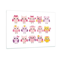 Impression sur verre - Image sur verre - Hiboux colorés aux motifs variés sur fond blanc - 120x80cm - L'un est plus doux que l'autre - Décoration murale moderne pour le salon et la chambre ARTTOR