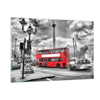 Impression sur verre - Image sur verre - Un bus rouge sur un paysage urbain en noir et blanc - 120x80cm - La vraie circulation sanguine de la ville - Décoration murale moderne pour le salon et la chambre ARTTOR