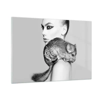 Impression sur verre - Image sur verre - Portrait d'une femme avec un chinchilla en noir et blanc - 100x70cm - Dame au chinchilla - Décoration murale moderne pour le salon et la chambre ARTTOR