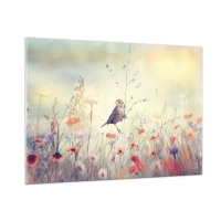 Impression sur verre - Image sur verre - Un oiseau dans une prairie fleurie au soleil - 100x70cm - Portrait d'oiseau sur pré en fond - Décoration murale moderne pour le salon et la chambre ARTTOR