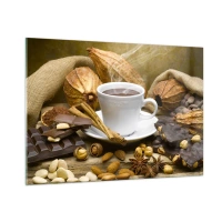 Impression sur verre - Image sur verre - Une tasse de chocolat chaud entourée de chocolat et d'épices - 100x70cm - Pour les amateurs de sensations fortes - Décoration murale moderne pour le salon et la chambre ARTTOR