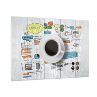 Impression sur verre - Image sur verre - Une tasse de café sur fond de diagrammes et de dessins conceptuels - 100x70cm - Il est temps de faire une pause - Décoration murale moderne pour le salon et la chambre ARTTOR