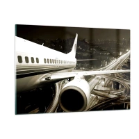 Impression sur verre - Image sur verre - Un avion au dessus de la ville la nuit avec une ambiance industrielle - 120x80cm - Vole dans la nuit - Décoration murale moderne pour le salon et la chambre ARTTOR