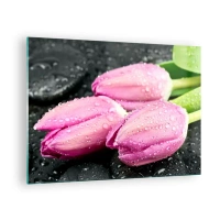 Impression sur verre - Image sur verre - Trois tulipes roses recouvertes de gouttes d'eau sur fond noir. - 70x50cm - Lilas trois sur une pierre noire - Décoration murale moderne pour le salon et la chambre ARTTOR
