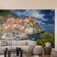 Papier Peint Photo Premium Canvas - Maisons colorées sur une falaise surplombant la mer aux Cinque Terre - 100x70cm - Un groupe embrassant les rochers - Décoration murale moderne pour le salon et la chambre ARTTOR