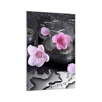 Impression sur verre - Image sur verre - Pierres noires et fleurs roses style spa - 70x100cm - Et le cœur s'allège soudainement - Décoration murale moderne pour le salon et la chambre ARTTOR
