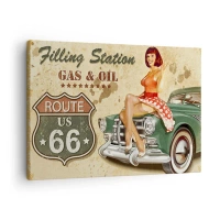 Impression sur toile - Image sur toile - Affiche rétro de la Route 66 avec une pin-up et une voiture - 70x50cm - Les superbes années 40. - Décoration murale moderne pour le salon et la chambre ARTTOR
