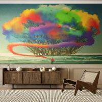 Papier Peint Photo Premium Sand - Un arbre entouré de fumée colorée et une silhouette avec une fusée éclairante - 100x70cm - Donner vie à ce monde - Décoration murale moderne pour le salon et la chambre ARTTOR