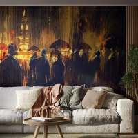 Papier Peint Photo Standard Eco - Une scène de ville sombre et pluvieuse avec des personnages sous des parapluies. - 100x70cm - Adeptes de la pluie - Décoration murale moderne pour le salon et la chambre ARTTOR