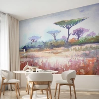 Papier Peint Photo Standard Eco - Un paysage de savane à l'aquarelle avec des arbres caractéristiques - 100x70cm - Couleurs de savane - Décoration murale moderne pour le salon et la chambre ARTTOR