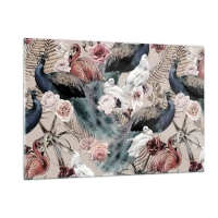 Impression sur verre - Image sur verre - Paons et flamants roses entourés de roses et de fougères - 120x80cm - Dans un jardin de palace - Décoration murale moderne pour le salon et la chambre ARTTOR