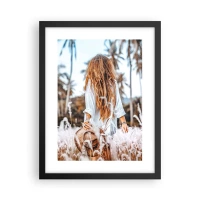 Impression sur verre - Image sur verre - Une femme dans l'herbe avec un chapeau à la main sur fond de palmiers - 120x80cm - Né de peluches d'herbe - Décoration murale moderne pour le salon et la chambre ARTTOR