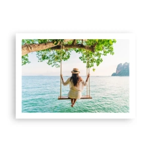 Affiche - Poster - Femme sur une balançoire au bord de la mer dans un paysage tropical - 100x70cm - La vie est belle - Décoration murale moderne pour le salon et la chambre ARTTOR
