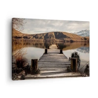 Impression sur toile - Image sur toile - Une jetée en bois sur un lac entouré de collines pittoresques - 50x70cm - Paysage silencieux - Décoration murale moderne pour le salon et la chambre ARTTOR