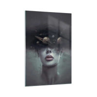 Impression sur verre - Image sur verre - Un visage de femme avec un motif de planète et d'espace en arrière-plan - 70x100cm - Et les planètes deviennent folles... - Décoration murale moderne pour le salon et la chambre ARTTOR