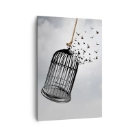 Impression sur toile - Image sur toile - Des oiseaux s'envolent d'une cage dans le ciel - 70x100cm - Foie...Espoir...Liberté! - Décoration murale moderne pour le salon et la chambre ARTTOR