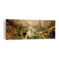 Impression sur toile - Image sur toile - Une cascade forestière sous les rayons du soleil, entourée de verdure - 140x50cm - Cascade de forêt en vert - Décoration murale moderne pour le salon et la chambre ARTTOR