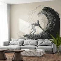 Papier Peint Photo Premium Sand - Un surfeur sur une vague dans un graphisme stylisé noir et crème - 100x70cm - Le roi de la vague - Décoration murale moderne pour le salon et la chambre ARTTOR