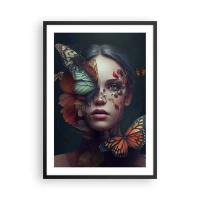 Affiche dans un cadre noir - Poster - Portrait d'une femme avec des papillons et des feuilles - 50x70cm - Une merveilleuse métamorphose - Décoration murale moderne pour le salon et la chambre ARTTOR