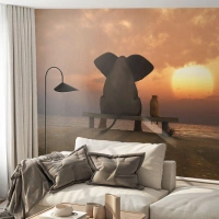 Papier Peint Photo Premium Canvas - Un éléphant et un chien sont assis sur un banc sur la plage au coucher du soleil. - 100x70cm - C'est bon de garder le silence ensemble - Décoration murale moderne pour le salon et la chambre ARTTOR