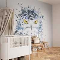 Papier Peint Photo Premium Canvas - Portrait abstrait d'un hibou aux couleurs bleu et jaune - 100x70cm - Droit dans les yeux - Décoration murale moderne pour le salon et la chambre ARTTOR