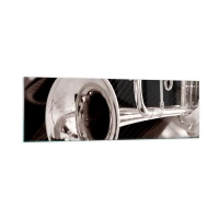 Impression sur verre - Image sur verre - Gros plan d'une trompette argentée sur un fond de tissu élégant. - 160x50cm - Voyage musical vers les années 30 - Décoration murale moderne pour le salon et la chambre ARTTOR