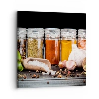 Impression sur toile - Image sur toile - Herbes et épices dans des bocaux en verre sur fond sombre - 70x50cm - Pour que la vie ait du goût - Décoration murale moderne pour le salon et la chambre ARTTOR