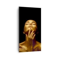 Impression sur verre - Image sur verre - Portrait d'une femme dans une lueur dorée sur fond noir - 80x120cm - Comme de la soie dorée - Décoration murale moderne pour le salon et la chambre ARTTOR