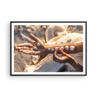 Affiche dans un cadre noir - Poster - Mains avec des coquillages disposés sur le fond de sable - 100x70cm - La beauté à portée de main - Décoration murale moderne pour le salon et la chambre ARTTOR