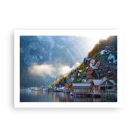 Affiche - Poster - Un village de montagne au bord d'un lac dans un paysage d'automne - 100x70cm - Ambiance alpine - Décoration murale moderne pour le salon et la chambre ARTTOR